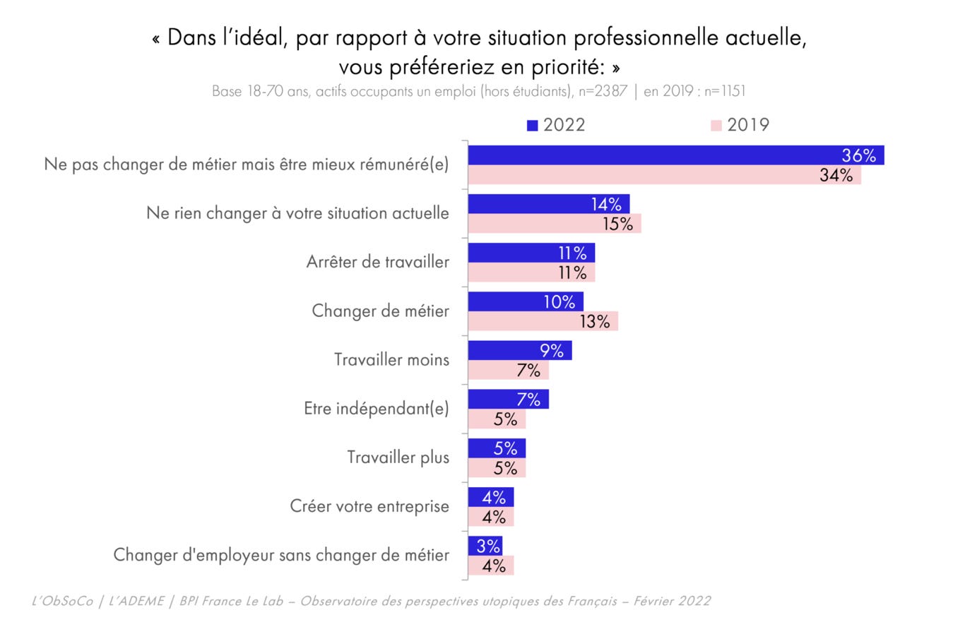 « Ne pas changer de métier mais être mieux rémunéré(e) » se détache nettement, avec 36 % des suffrages (+ 2 points par rapport à 2019), ce qui confirme l’importance de la problématique du pouvoir d’achat dans les aspirations des Français.