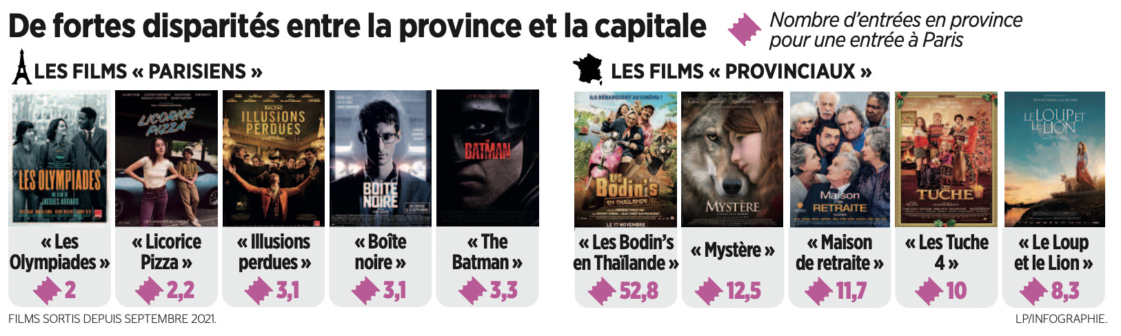 On apprend que le film “Les Bodin’s en Thaïlande” de Frédéric Forestier (1,6 millions d’entrées en 2021) a un coefficient record de 52,7 : passé totalement inaperçu en région parisienne (le film n’était diffusé que dans deux salles), il a fait un carton en province.