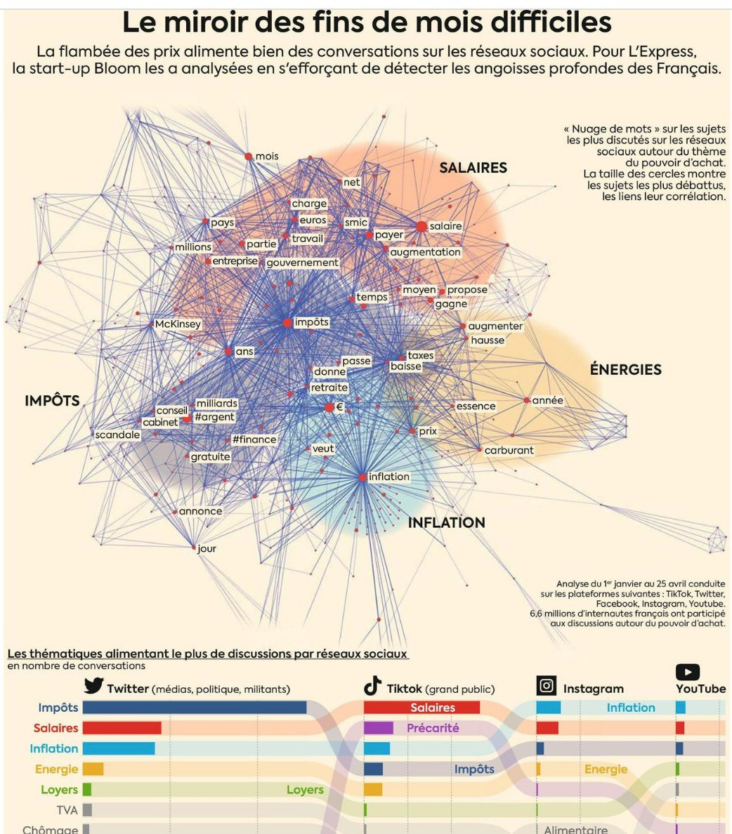 Le pouvoir d’achat s’est imposé comme la première préoccupation des Français, loin, très loin devant toutes les autres. Mais comment en parlent-ils ? Pour L’Express, la start-up Bloom a analysé les conversations sur les réseaux sociaux, et en a tiré un nuage de mots.