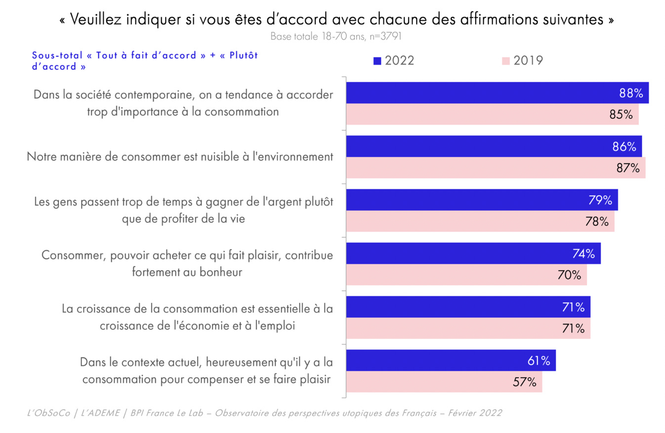 « Dans le contexte actuel, heureusement qu’il y a la consommation pour compenser et se faire plaisir » (61%, + 4 pts) et « Consommer, pouvoir acheter ce qui fait plaisir, contribue fortement au bonheur » (74%, +4 pts).