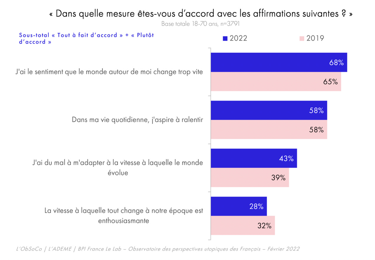 L’enquête témoigne d’un certain malaise à l’égard de la vitesse à laquelle change le monde. Les Français sont 68 % à reconnaître avoir « le sentiment que le monde autour [d’eux] change trop vite » (+3 pts par rapport à 2019), et 43 % à admettre avoir du mal à s’adapter à cette vitesse (+4 pts). À l’inverse, 28 % trouvent que « la vitesse à laquelle tout change à notre époque est enthousiasmante » (-4 pts ).