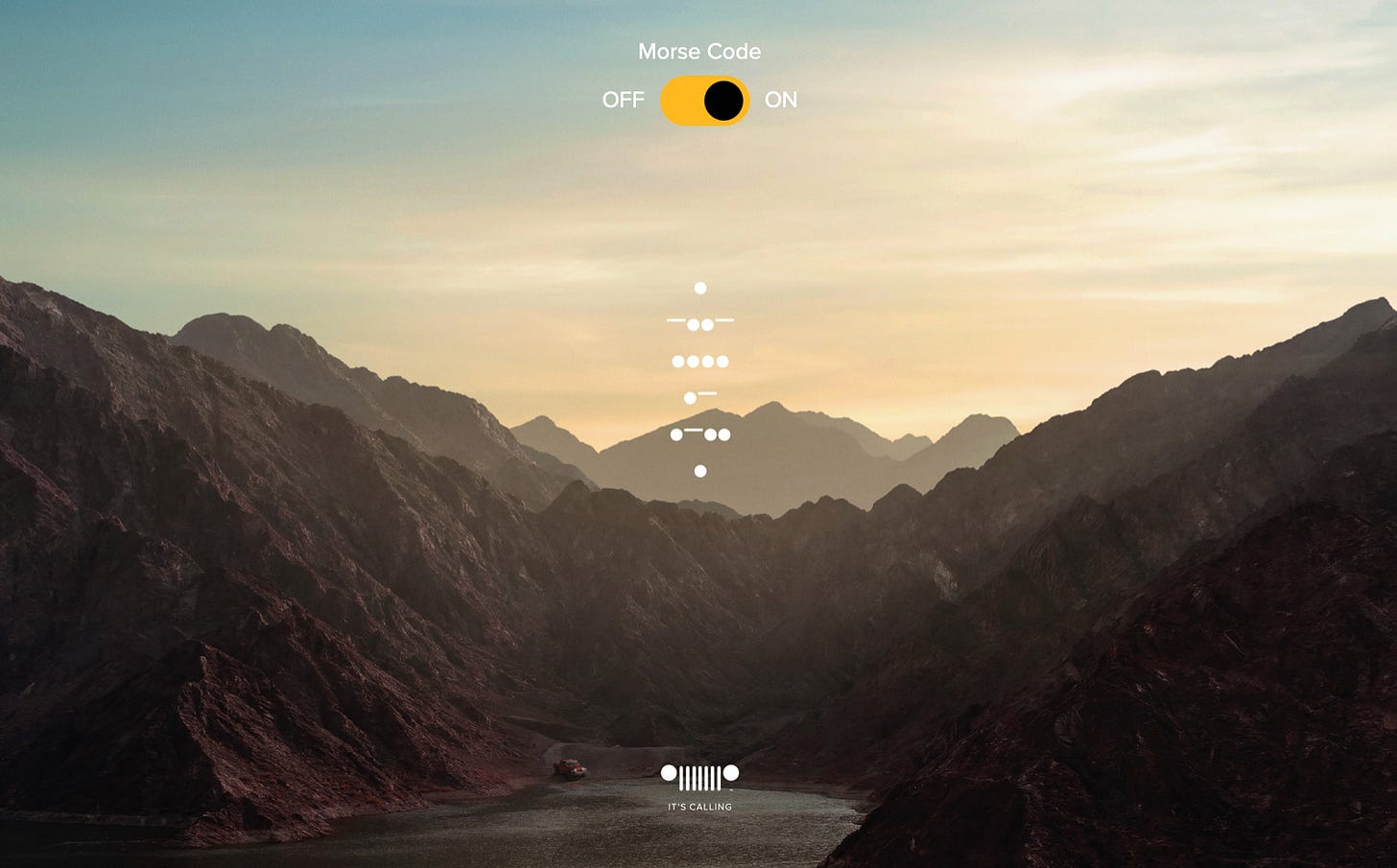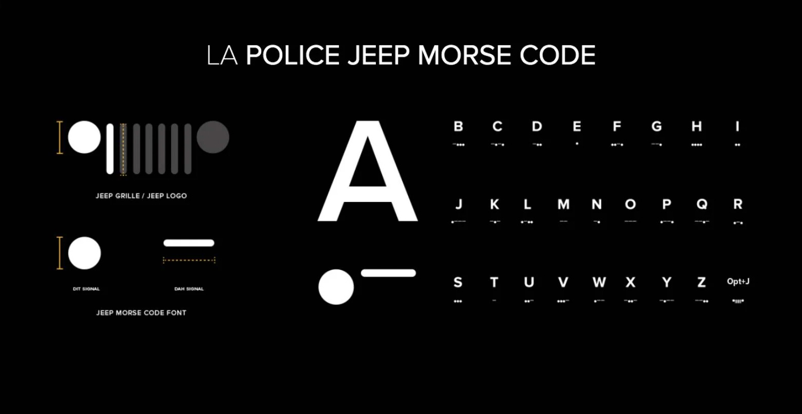 Dans sa dernière campagne (“The Call of Adventure”), Jeep a conçu une nouvelle police de caractères qui s’inspire à la fois du morse et des traits distinctifs qui composent le O|||||||O de sa calandre.