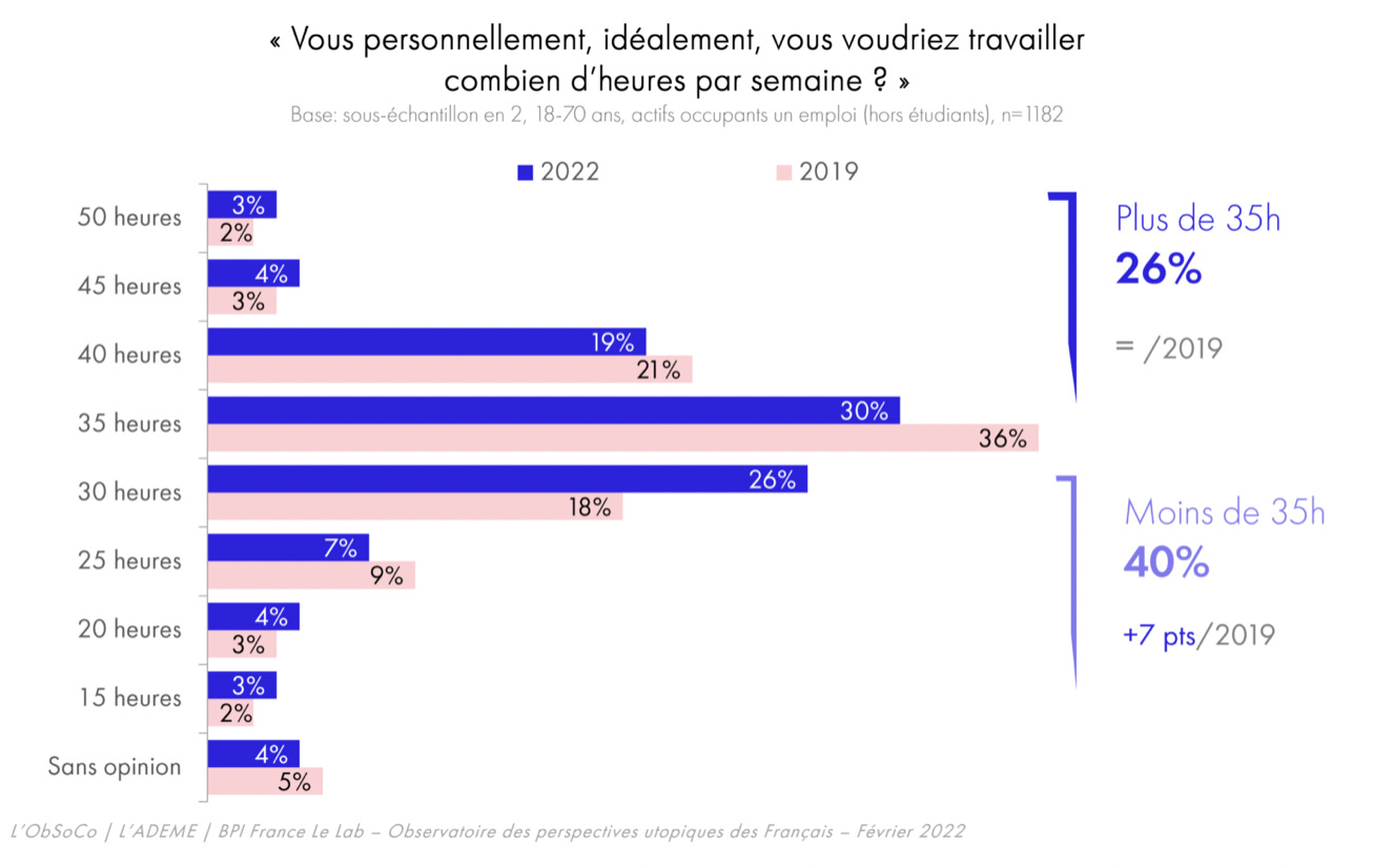 “Si aujourd’hui 26% des actifs disent vouloir travailler plus que 35 heures hebdomadaires (une proportion équivalente à 2019), 30% aimeraient travailler 35 heures (6 points de moins) mais 40% aspireraient à travailler moins que 35 heures, soit 7 points de plus en 2 ans (…). Si une majorité de ces actifs qui souhaitent travailler moins que 35 heures ne se montrent pas prêts à une baisse de salaires, il en est tout de même 40% qui le sont, soit 9 points de plus qu’en 2019 !”