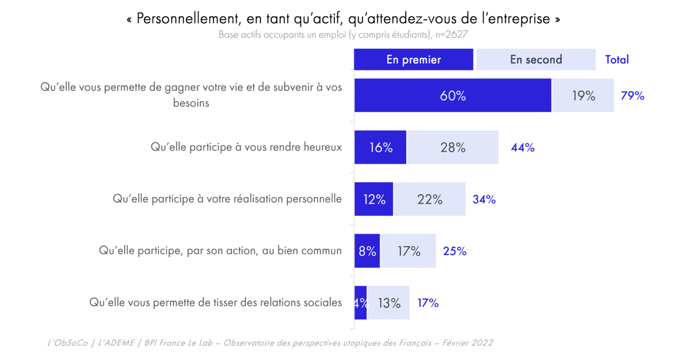Seuls 25% des interrogés attendent de l’entreprise “qu’elle participe, par son action, au bien commun”. En revanche, 44 % ont opté pour « qu’elle participe à vous rendre heureux » et 34 % « qu’elle participe à votre réalisation personnelle », “soit 77 % qui ont mis en avant la contribution de l’entreprise au bien-être personnel”, note l’ObSoCo