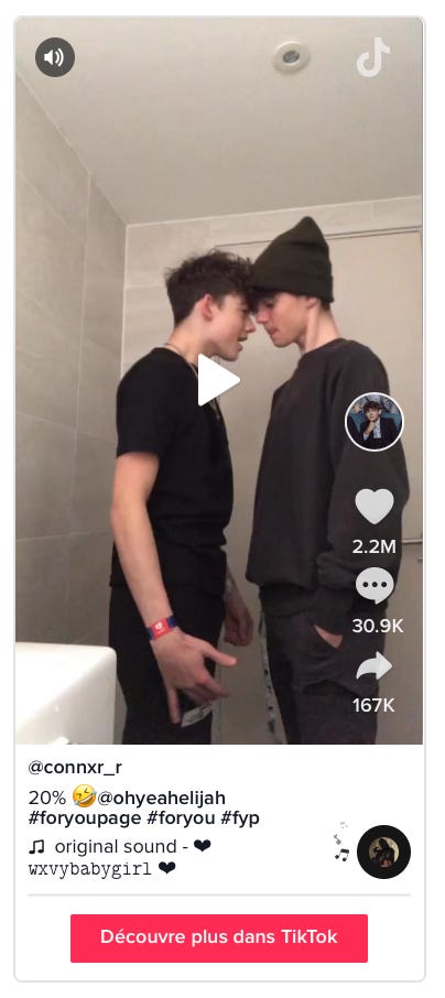 Pépite dénichée par l’ADN. “Ils sont jeunes, beaux, hétérosexuels et ils se filment en train de faire des câlins, bisous ou danses suggestives avec leurs copains. Bienvenue dans le monde des homiesexuels ». Preuve supplémentaire que la Gen Z développe une toute autre conception de la masculinité …