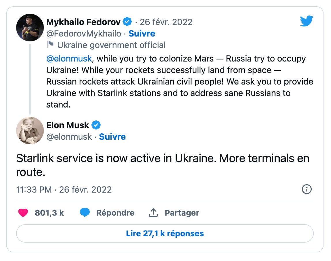 Techno-politique, enfin. “Musk est en train de construire une puissance géopolitique formelle, complémentaire des prérogatives actuelles des États-Unis”. Dans un article qui a fait beaucoup de bruit aux Etats-Unis, le New York Times a parlé de lui comme d’un “Geopolitical Chaos Agent”. De fait, sur les seules quatre dernières semaines, Elon Musk a proposé un plan de paix pour la Russie et l'Ukraine, au grand dam des responsables ukrainiens ; il a publié un tweet sur l'accès à Internet iranien qui a exposé les manifestants du gouvernement à un stratagème de phishing ; il a également suggéré dans une interview que la Chine pourrait être apaisée si elle recevait un contrôle partiel sur Taiwan.