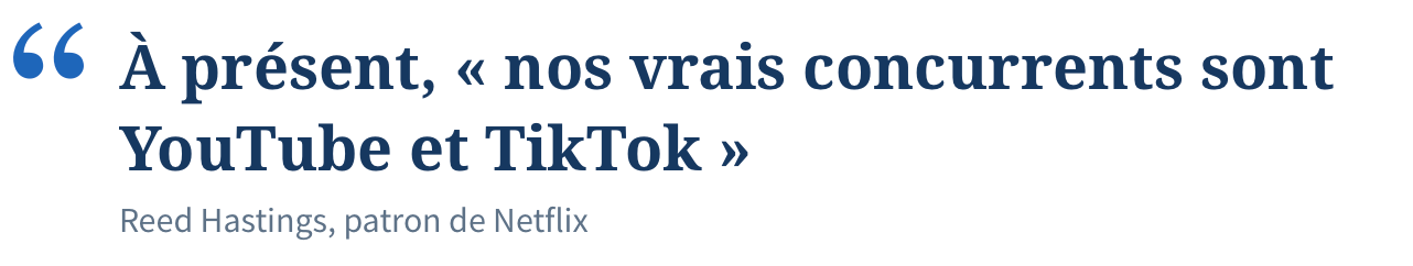 “Ces miniclips de quelques secondes ou de dix minutes pour les plus longs, que les jeunes voient défiler sur leurs portables à la manière de programmes s’enchaînant à la télévision, sont en train de ringardiser les films et les épisodes de série: trop longs, trop lents, trop fastidieux à regarder… Même Reed Hastings, de passage en Italie pour inaugurer des bureaux Netflix en mai dernier, s’en est ému. «Les jeunes ont une sensibilité différente, expliquait-il, interrogé par le magazine Screendaily à propos de la concurrence de TikTok et YouTube. Nous devons tous investir dans la production télévisuelle et cinématographique pour éviter que cette forme d’art ne soit écrasée et garder ces histoires vivantes.» Car avec ses défis et ses musiques virales, «TikTok est tout simplement plus amusant. C’est le remède ultime contre l’ennui», considère l’analyste Richard Greenfield. Et un possible dynamiteur de l’écosystème médiatique tel qu’il existe aujourd’hui”