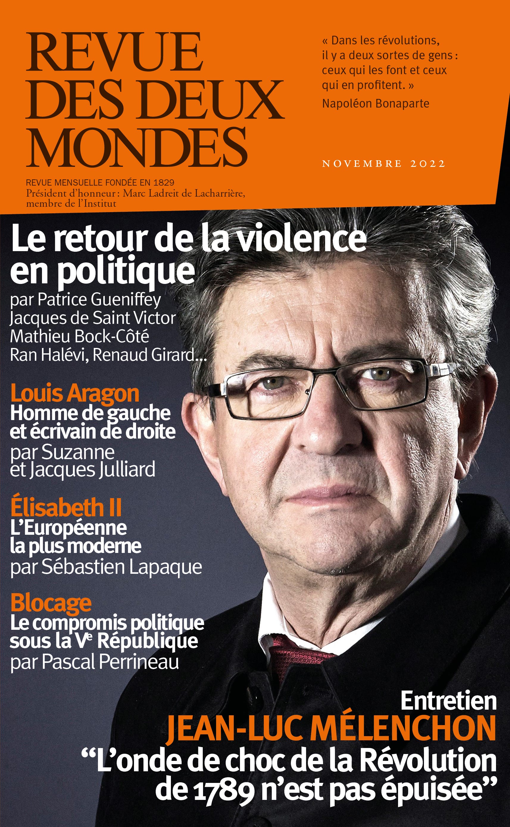 Numéro très intéressant de La Revue des deux mondes, qui donne la parole à des intellectuels et politiques de bords très différents pour explorer le thème du retour de la violence en politique. On découvre qu’aux Etats-Unis entre 15 et 20 millions d’Américains pensent que la violence serait justifiée pour réinstaller Trump au pouvoir. On y lit aussi Jean-Luc Mélenchon théoriser la stratégie de la conflictualité. Tout en tentant une distinction entre la « violence révolutionnaire », qu’il réprouve, et le conflit politique, dont il se revendique, il explique :