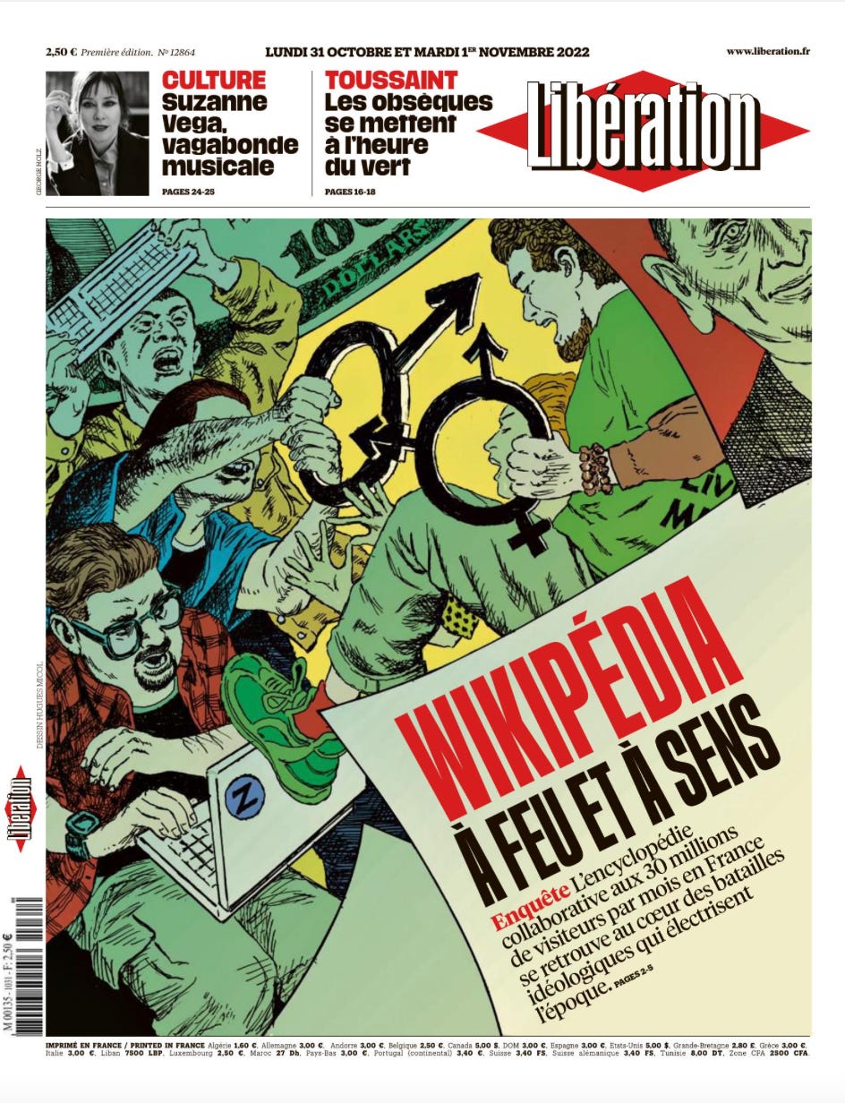 “Pendant que les agences de com rivalisent de stratégies pour ripoliner les pages de leurs clients, l’extrême droite s’essaye à l’entrisme dans ce qu’ils appellent «Wokipédia». A l’inverse, des militants antiracistes et féministes dénoncent «un bruit de fond» réactionnaire dans les entrailles de l’encyclopédie”