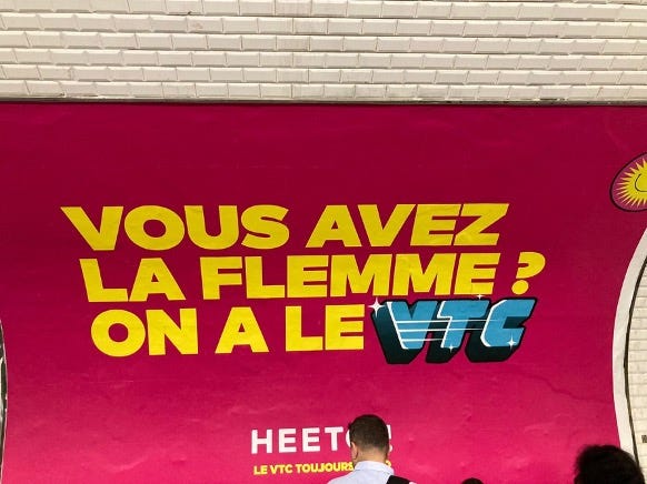 “Enfin, dernier exemple s’il en fallait, le secteur des transports de voyageurs à la demande surfe lui aussi sur la tendance à la flemme, en témoigne la campagne de publicité de la plateforme Heetch que l’on pouvait retrouver dans les tunnels du métro parisien en octobre dernier : « Vous avez la flemme ? On a le VTC »”