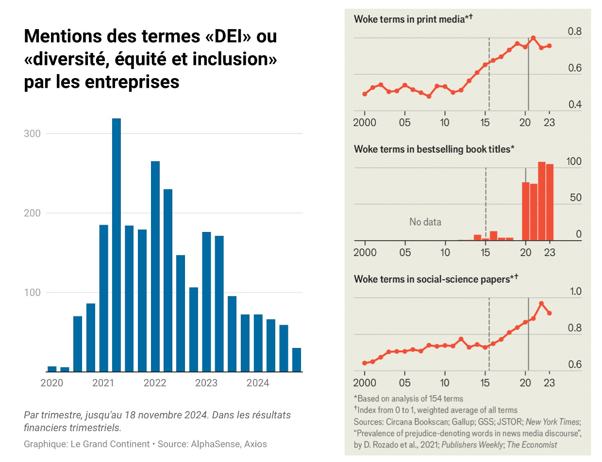Une réflexion rapide tirée de deux articles : le premier (Le Grand continent) a mesuré l'évolution des mentions des termes “DEI” ou “diversité, équité et inclusion” par les entreprises entre 2020 et 2024 ; le second (The Economist) a mesuré l’évolution de l’occurence du mot “woke” dans les publications (médias, livres, revues de sciences sociales). Dans les deux cas, il apparaît qu’après un pic autour de l’année 2021, la décrue s’observe nettement dès l’année 2023. Autrement dit : le renversement culturel et idéologique précède l’élection de Donald Trump.