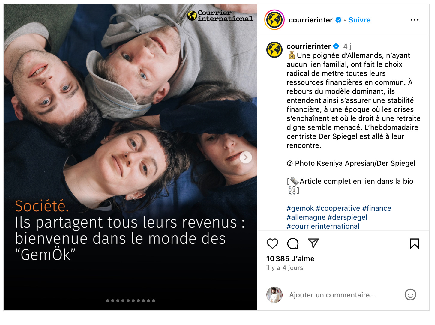 Un article de Der Spiegel, traduit par Courrier international, s’est penché sur un phénomène social émergent outre-Rhin : les “GemÖk” (pour “gemeinsame Ökonomie”, “économie commune”). Il s’agit de collectifs, allant de deux à plusieurs dizaines de membres, qui peuvent ne pas vivre ensemble, mais qui ont pris la décision de mettre en commun leur argent.