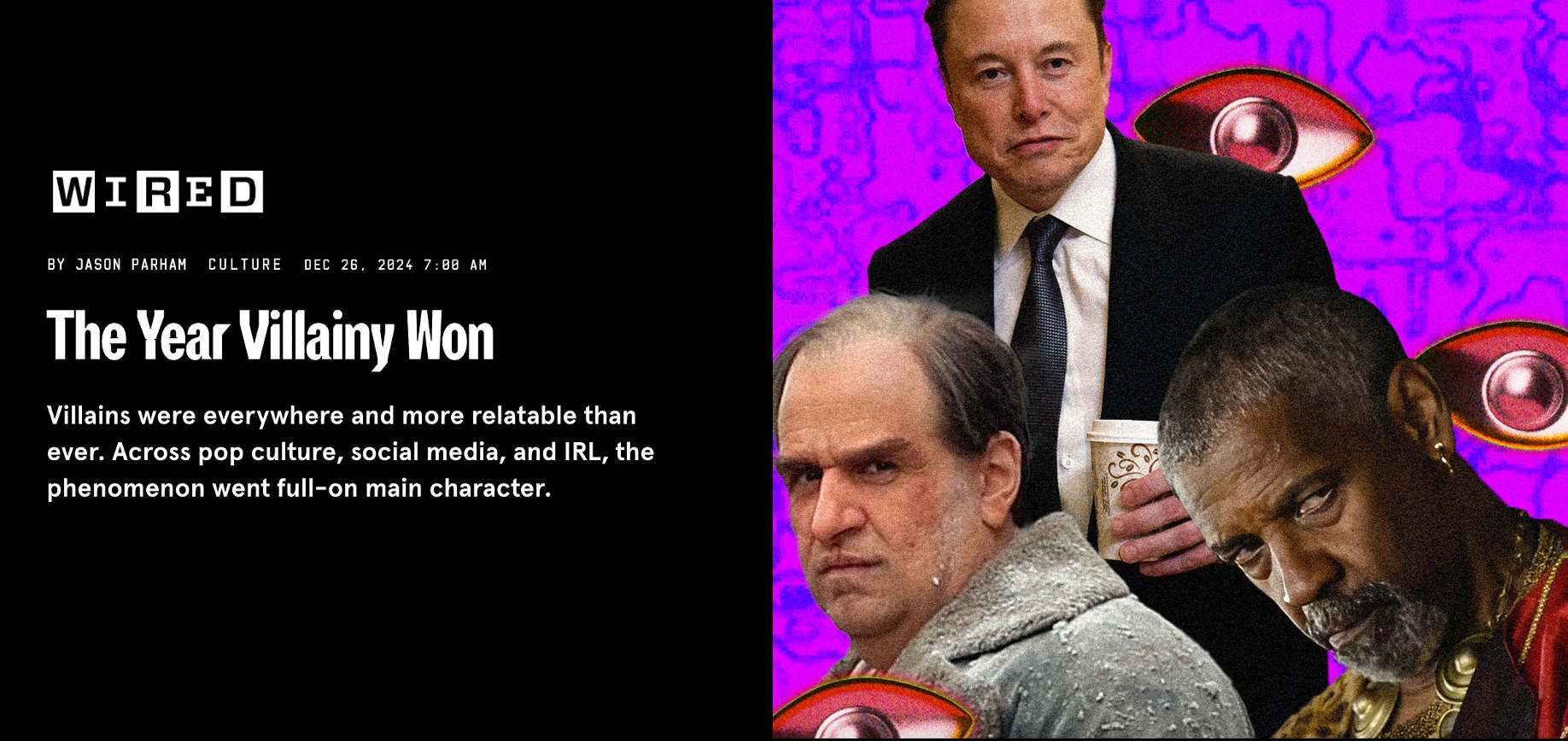 Si les outrances de Trump ou de Musk suscitent tant de fascination, et aussi peu de rejet, c’est peut-être parce que l’ensemble des acteurs de la pop culture nous y a préparé. Emilia Perez, The Penguin, Venom, Wednesday, Wicked, Beetlejuice, Joker, Godzilla Vs Kong, la collection Balenciaga 2025, Charlie XCX, Denzel Washington dans Gladiator II, l’agressivité de Kendrick Lamar contre Drake, la hype Luigi Mangione (le tueur de CEO), Joe Rogan, Squid Game 2, l’annonce de l’ouverture d’un parc Villains Land par Disney, etc … on assiste aujourd’hui à une glorification et même une coolisation inédite des “méchants”. Ce serait même une formidable entreprise de fabrique du consentement, écrit le média Wired dans l’un de ses derniers articles de l’année 2024 : "The Year Villainy Won".