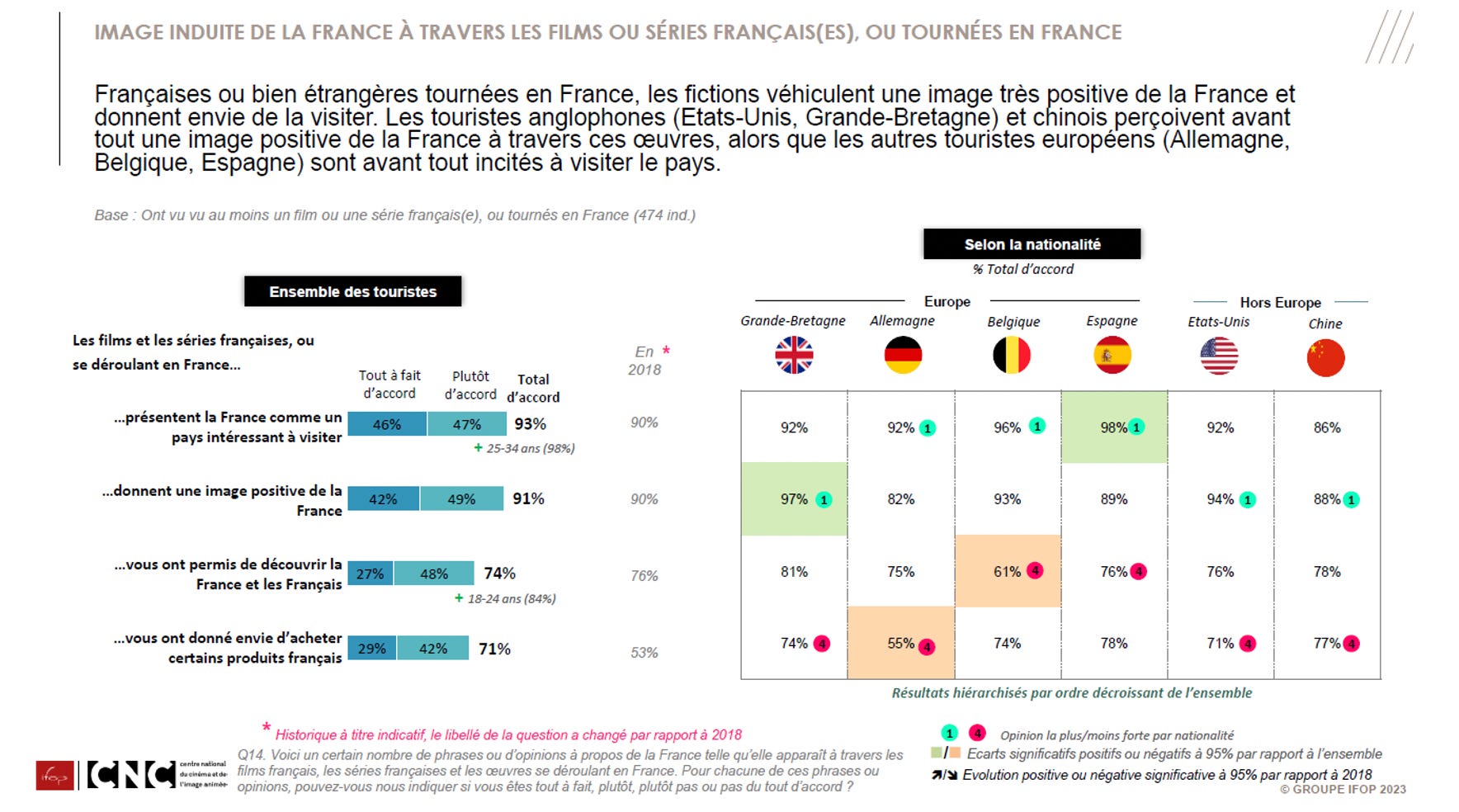 Une étude du CNC et de l'Ifop, basée sur l’interview de Français et de touristes étrangers (américains, anglais, allemands, belges, chinois, espagnols), révèle que 66% des Français ayant vu une production nationale souhaitent explorer les sites de tournage. Pour les voyageurs étrangers, l’effet est encore plus marqué : 80% affirment que les films ou séries français qu’ils ont regardés les motivent à venir en France, et 34% se disent même très motivés. Les intentions sont élevées, pour autant, seuls 22% des Français et 11% des touristes étrangers ont effectivement franchi le pas et visité des lieux de réalisation emblématiques.